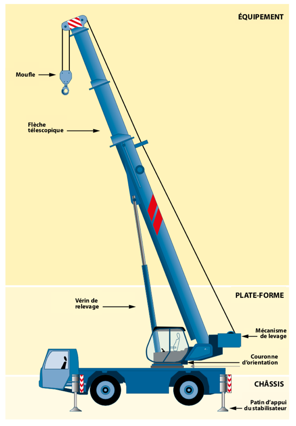 – de mettre au niveau la grue en décollant les roues, même si le sol est inégal, afin que tous les éléments participent à sa stabilisation.